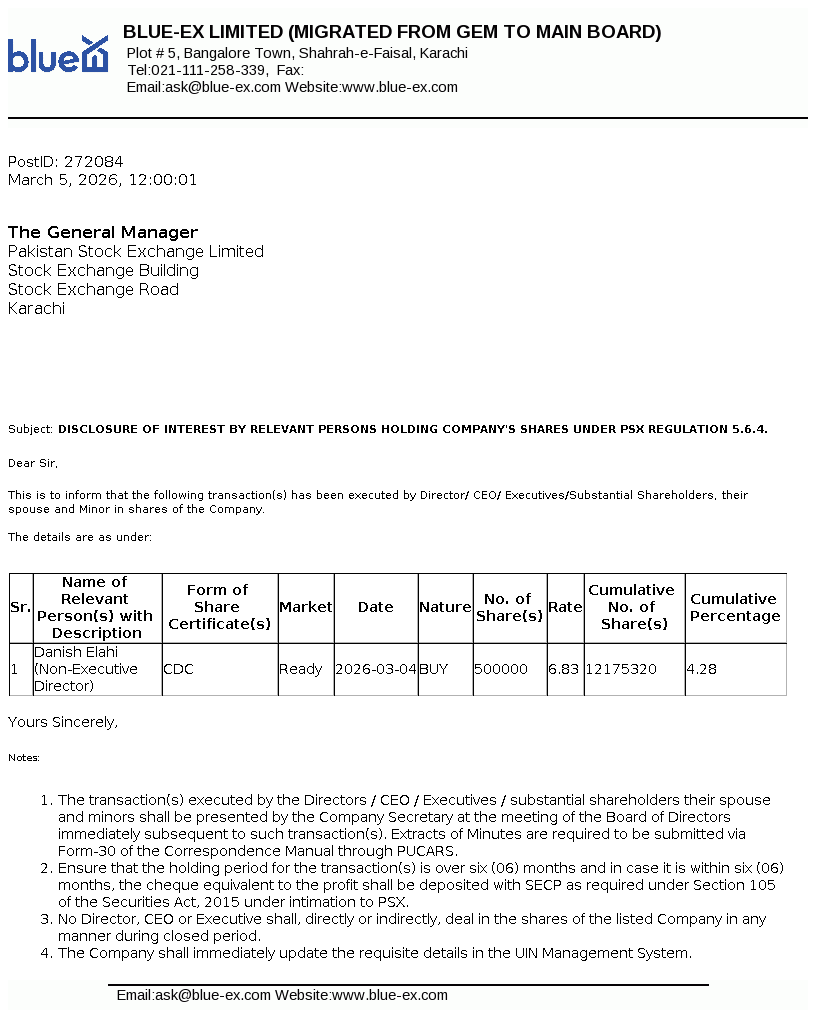 Disclosure of Interest by a Director CEO, or Executive of a listed company and their Spouses and the Substantial Shareholders u/c 5.6.1.(d) of PSX Regulations