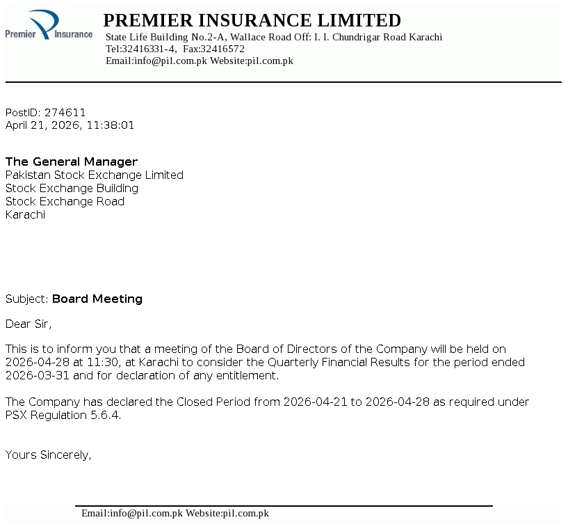 PINL Bonus Meeting Updated Apr 21, 2026, 06:38 AM Premier Insurance Limited Board Meeting & Closed Period Key Information Period Ended Mar 31, 2026Meeting Date Apr 28, 2026Meeting Agenda Quarterly Related Documents Download PDF View Image