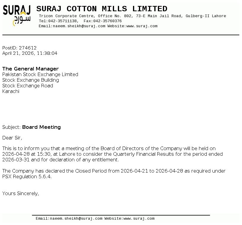 SURC Bonus Meeting Updated Apr 21, 2026, 06:38 AM Suraj Cotton Mills Limited Board Meeting Key Information Period Ended Mar 31, 2026Meeting Date Apr 28, 2026Meeting Agenda Quarterly Related Documents Download PDF View Image