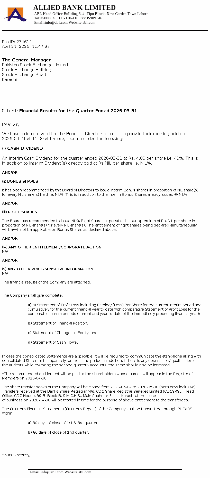 ABL Financial Results Updated Apr 21, 2026, 06:47 AM Allied Bank Limited Financial Results for the Quarter ended March 31, 2026 of Allied Bank Limited Key Information Period Ended Jan 1, 1970Meeting Date Apr 21, 2026 Related Documents Download PDF View Image