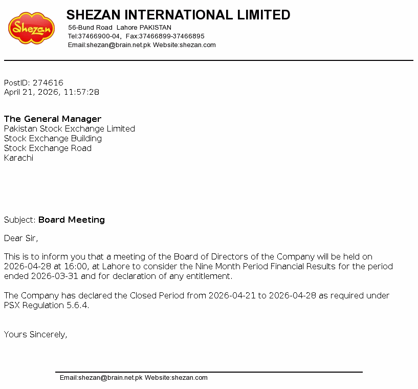 SHEZ Bonus Meeting Updated Apr 21, 2026, 06:57 AM Shezan International Board Meeting Key Information Period Ended Mar 31, 2026Meeting Date Apr 28, 2026Meeting Agenda Nine Month Period Related Documents Download PDF View Image