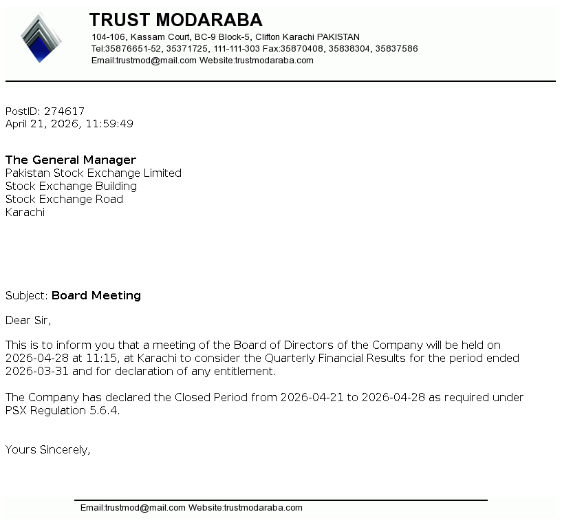 TRSM Bonus Meeting Updated Apr 21, 2026, 06:59 AM Trust Modaraba Board of Directors Meeting for the Quarter ended March 31, 2026. Key Information Period Ended Mar 31, 2026Meeting Date Apr 28, 2026Meeting Agenda Quarterly Related Documents Download PDF View Image