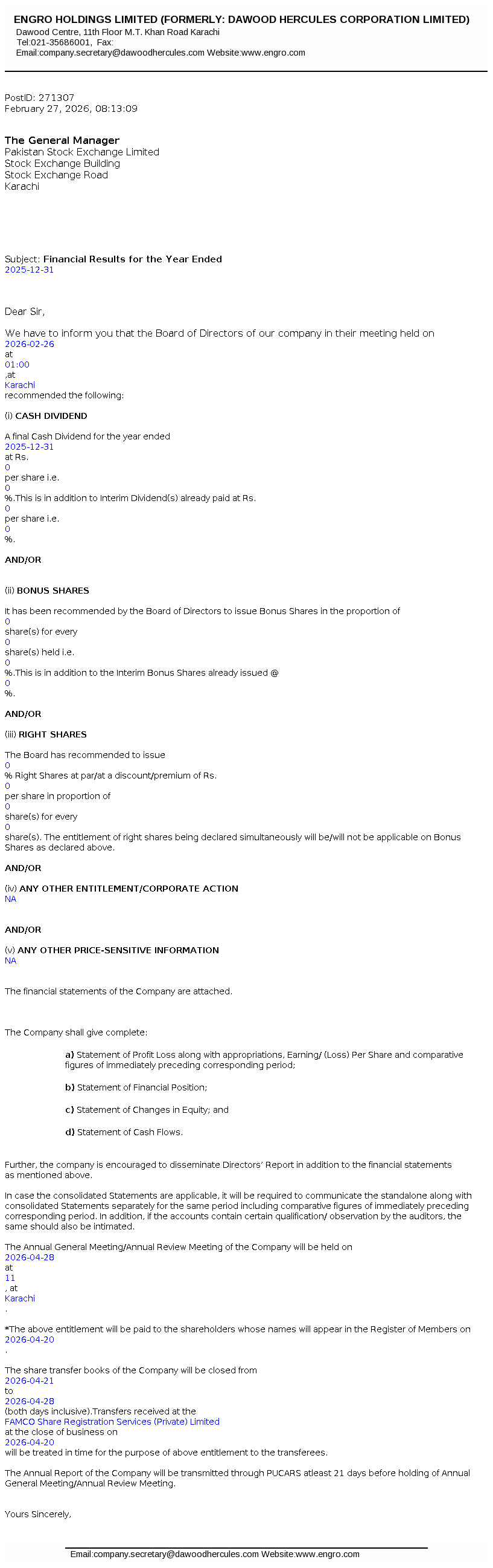 ENGROH Year End Results Mar 5, 2026, 04:46 AM Engro Holdings Limited Financial results for Year ended December 31, 2025 Key Information Period Ended Dec 31, 2025Meeting Date Feb 26, 2026Quarter YEAR Financial Highlights Quarter EPS PKR 0.21Profit After Tax PKR 253,154,000Net Sales PKR 549,958,000Cash Dividend Rs. 0/shareBonus Shares 0 Related Documents Download PDF View Image