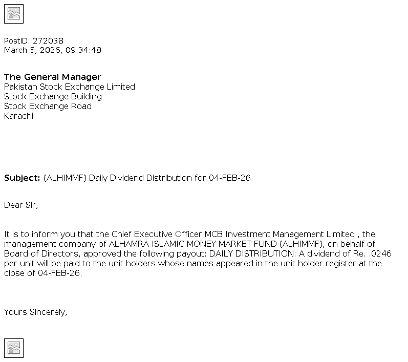 MCBIM-FUNDS Miscellaneous Updated Mar 5, 2026, 04:45 AM ALHAMRA ISLAMIC MONEY MARKET FUND (ALHIMMF) Daily Dividend Distribution for 04-FEB-26 Related Documents Download PDF View Image