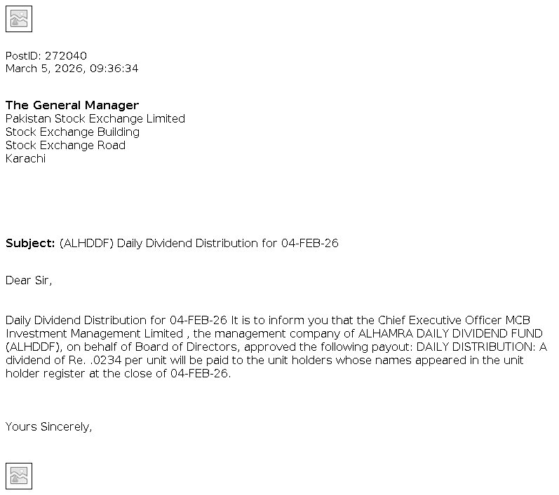 MCBIM-FUNDS Miscellaneous Updated Mar 5, 2026, 04:44 AM ALHAMRA DAILY DIVIDEND FUND (ALHDDF) Daily Dividend Distribution for 04-FEB-26 Related Documents Download PDF View Image
