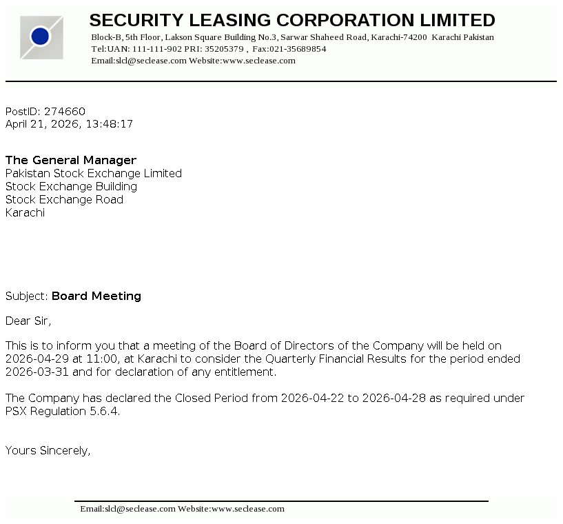 SLCL Bonus Meeting Updated Apr 21, 2026, 08:48 AM Security Leasing Corporation Limited Board Meeting Key Information Period Ended Mar 31, 2026Meeting Date Apr 29, 2026Meeting Agenda Quarterly Related Documents Download PDF View Image