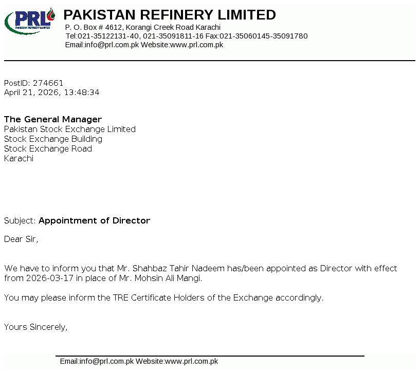 PRL Corporate Notice Updated Apr 21, 2026, 08:48 AM Pakistan Refinery Limited Change of Director Related Documents View Image
