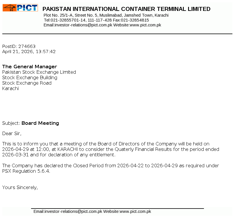 PICT Bonus Meeting Updated Apr 21, 2026, 08:57 AM Pakistan International Container Terminal Limited Board Meeting of Pakistan International Container Terminal Limited Key Information Period Ended Mar 31, 2026Meeting Date Apr 29, 2026Meeting Agenda Quaterly Related Documents Download PDF View Image