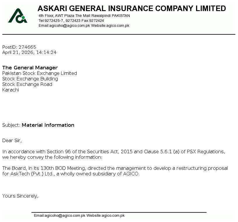 AGIC Material Information Updated Apr 21, 2026, 09:14 AM Askari General Insurance Company Material Information - Restructuring Proposal Related Documents Download PDF View Image