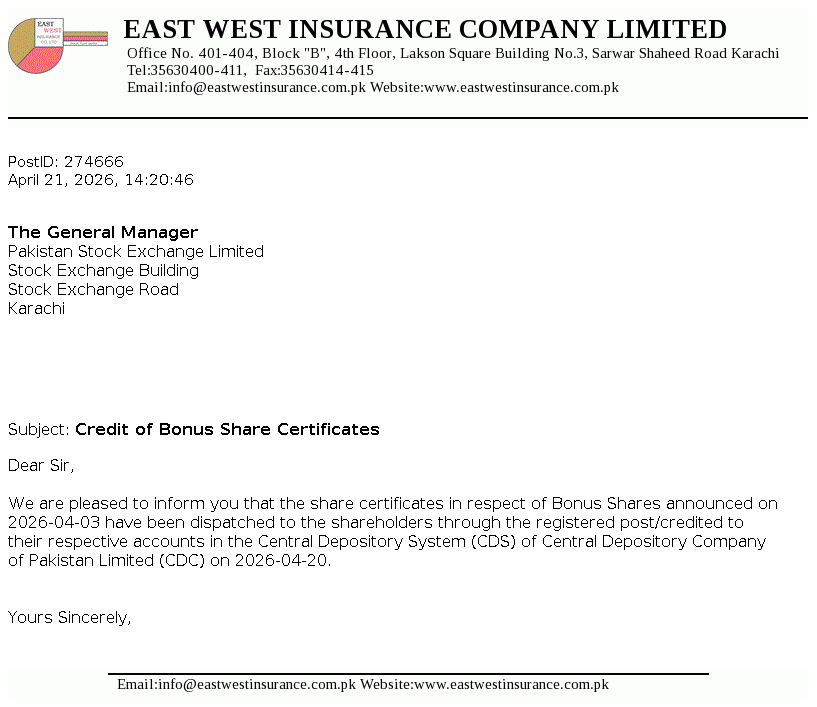 EWIC CBSCV10111 Updated Apr 21, 2026, 09:20 AM East West Insurance Company Limited Credit of Bonus Share Certificates Related Documents View Image
