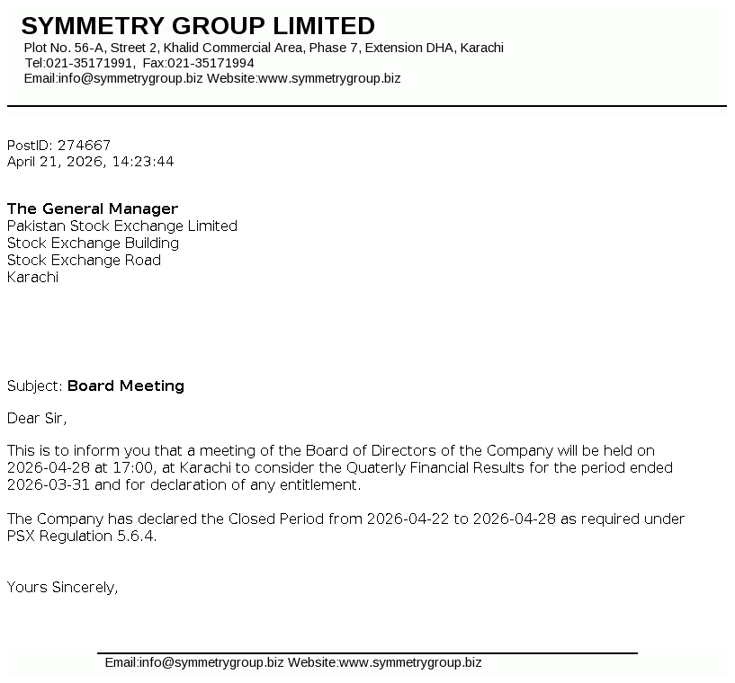 SYM Bonus Meeting Updated Apr 21, 2026, 09:23 AM Symmetary Group Limited Board Meeting Key Information Period Ended Mar 31, 2026Meeting Date Apr 28, 2026Meeting Agenda Quaterly Related Documents View Image