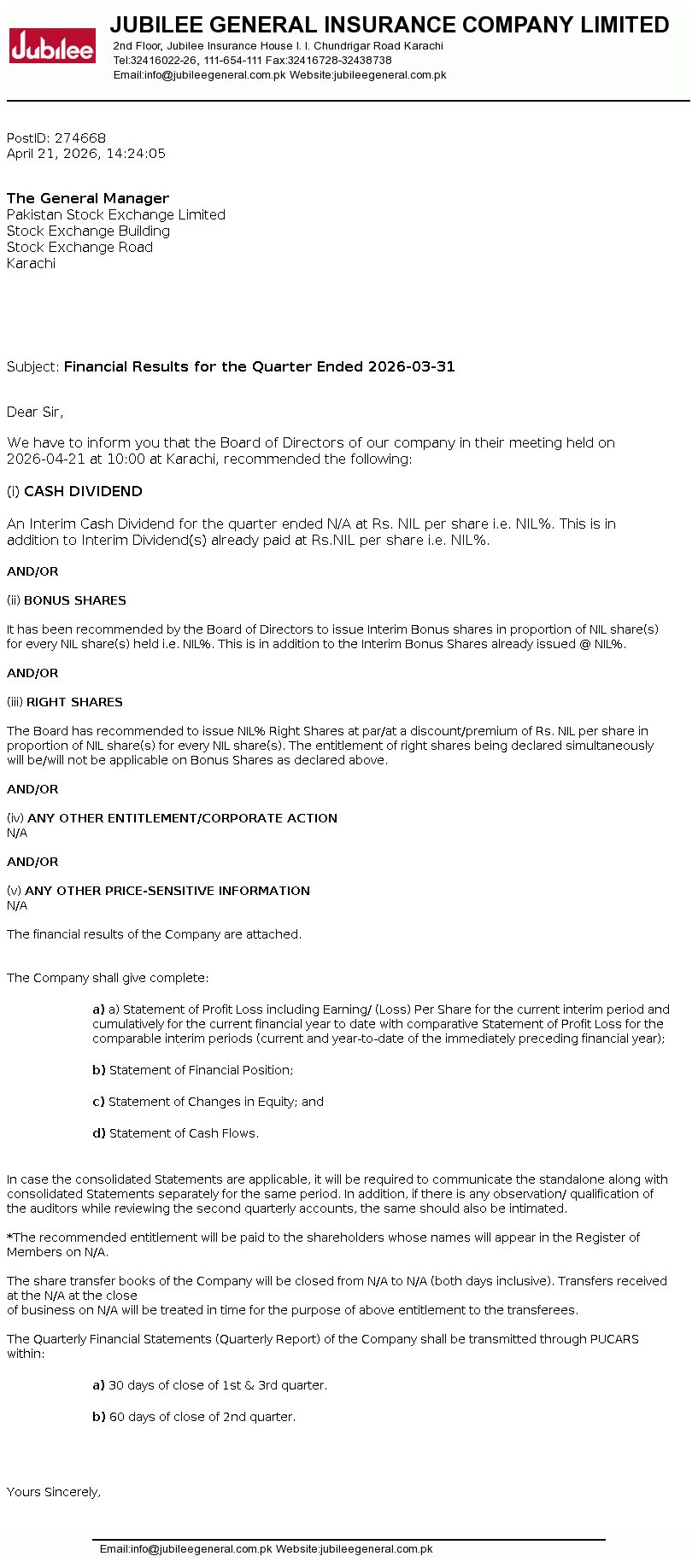JGICL Financial Results Updated Apr 21, 2026, 09:24 AM Jubilee General Insurance Company Limited Financial Results for the Quarter Ended March 31, 2026 Key Information Period Ended Mar 31, 2026Meeting Date Apr 21, 2026 Related Documents Download PDF View Image