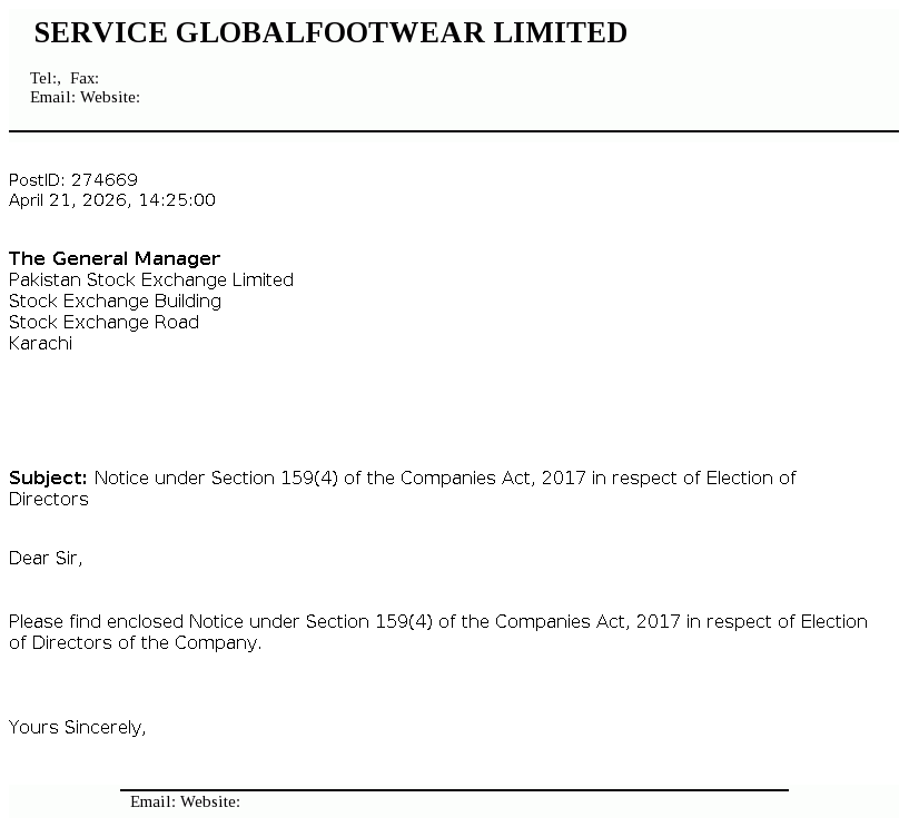 SGF Miscellaneous Updated Apr 21, 2026, 09:26 AM Service Global Footwear Limited Notice under Section 159(4) of the Companies Act, 2017 in respect of Election of Directors Related Documents Download PDF View Image