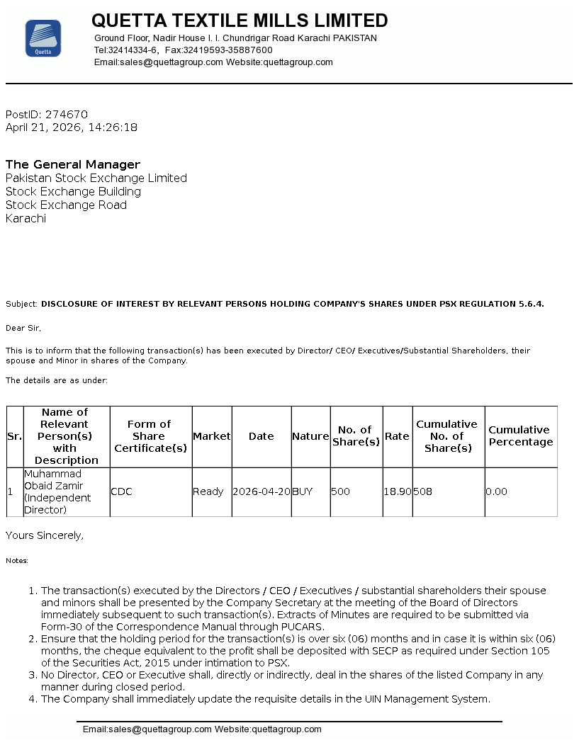 QUET Interest Disclosure Updated Apr 21, 2026, 09:26 AM Quetta Textile Mills Limited Disclosure of Interest by a Director CEO, or Executive of a listed company and their Spouses and the Substantial Shareholders u/c 5.6.1.(d) of PSX Regulations Related Documents View Image