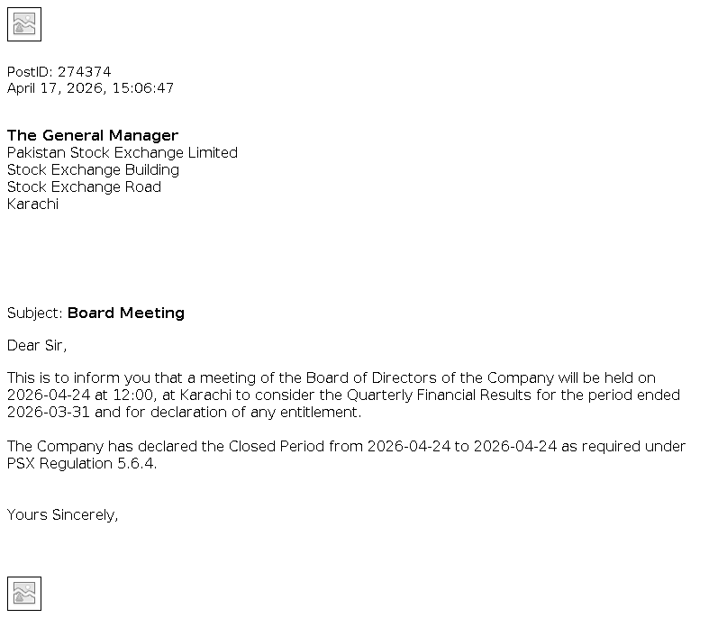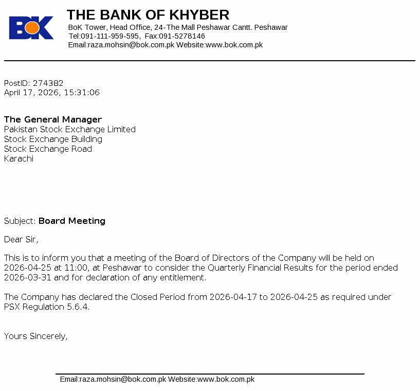 BOK Bonus Meeting Updated Apr 17, 2026, 10:31 AM The Bank Of Khyber Limited The Bank of Khyber-Board Meeting Key Information Period Ended Mar 31, 2026Meeting Date Apr 25, 2026Meeting Agenda Quarterly Related Documents Download PDF View Image