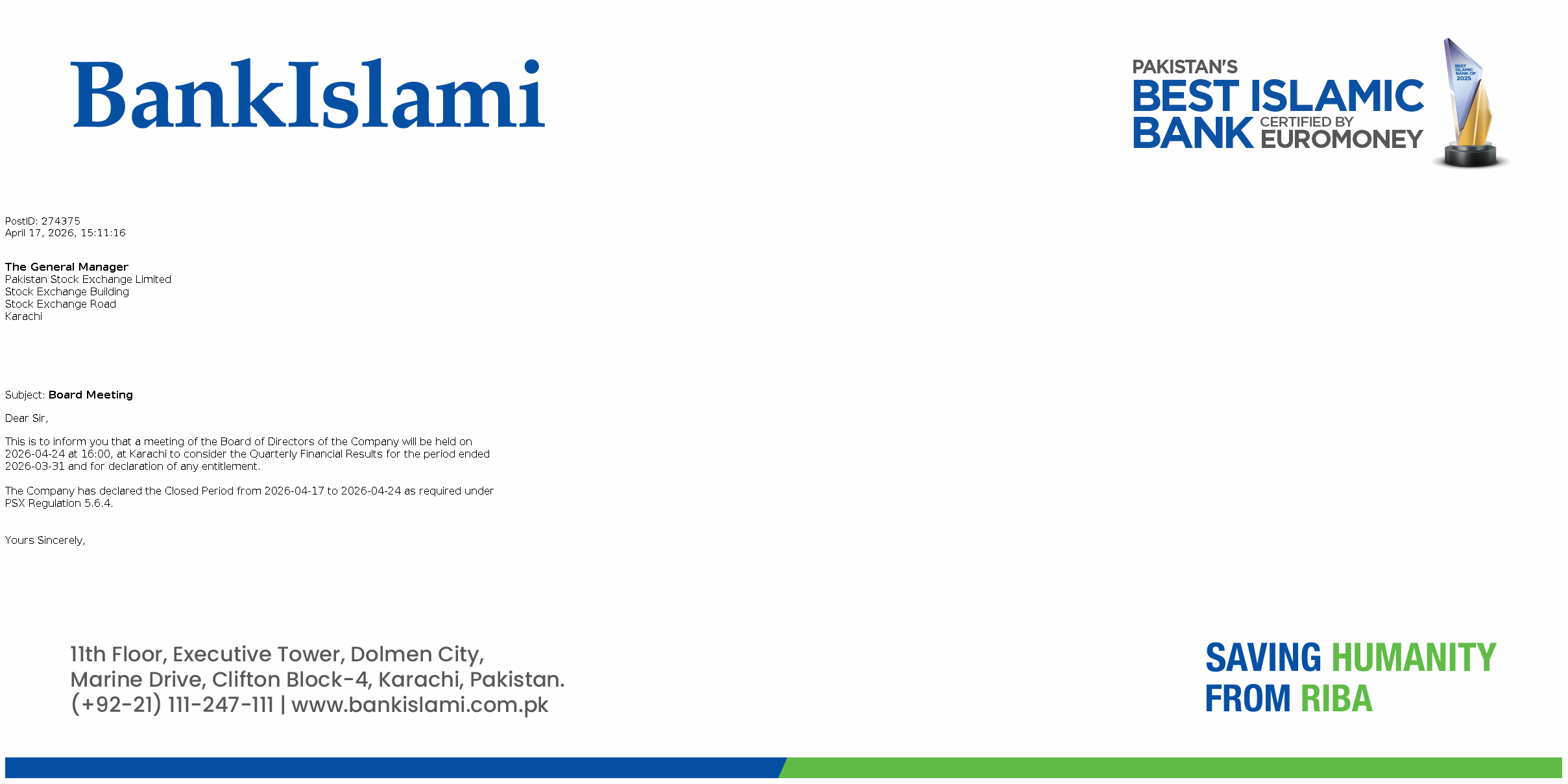 BIPL Bonus Meeting Updated Apr 17, 2026, 10:11 AM BankIslami Pakistan Limited Board Meeting - BankIslami Pakistan Limited Key Information Period Ended Mar 31, 2026Meeting Date Apr 24, 2026Meeting Agenda Quarterly Related Documents Download PDF View Image