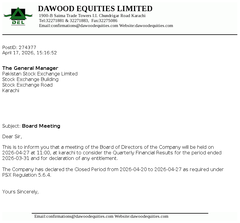 DEL Bonus Meeting Updated Apr 17, 2026, 10:17 AM Dawood Equities Limited Board Meeting Key Information Period Ended Mar 31, 2026Meeting Date Apr 27, 2026Meeting Agenda Quarterly Related Documents Download PDF View Image