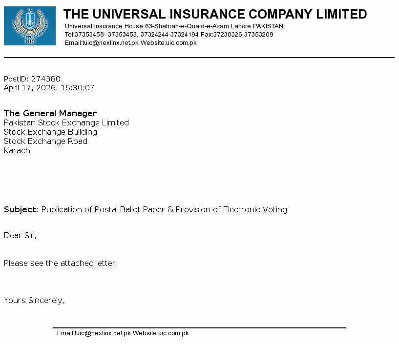 UVIC Miscellaneous Updated Apr 17, 2026, 10:31 AM Universal Insurance Company Limited Publication of Postal Ballot Paper & Provision of Electronic Voting Related Documents Download PDF View Image