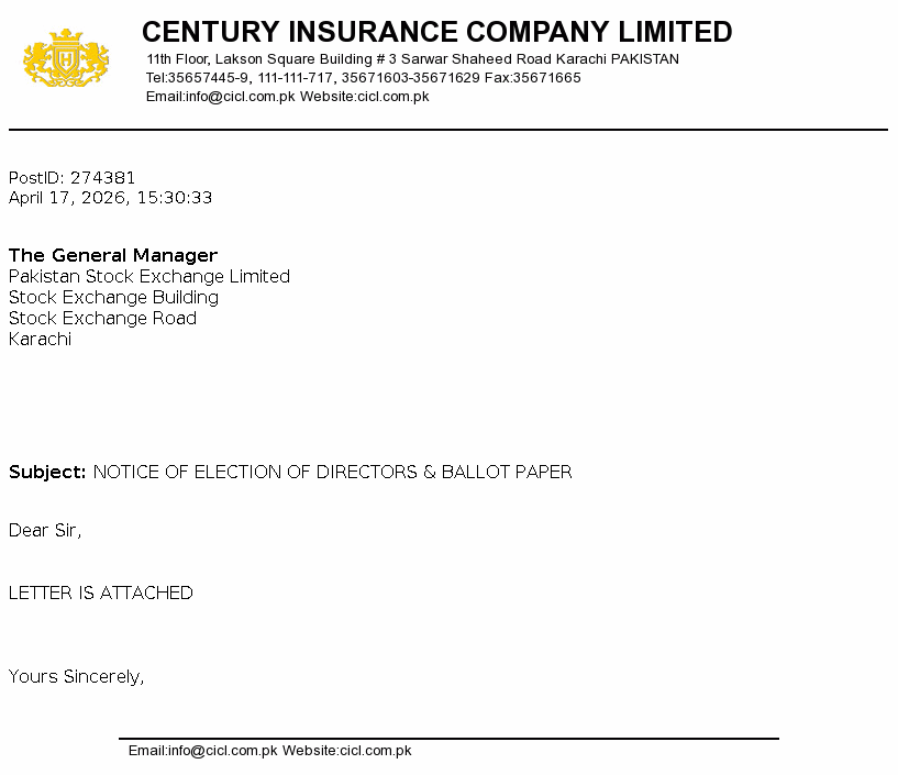 CENI Miscellaneous Updated Apr 17, 2026, 10:31 AM Century Insurance Limited NOTICE OF ELECTION OF DIRECTORS & BALLOT PAPER Related Documents Download PDF View Image