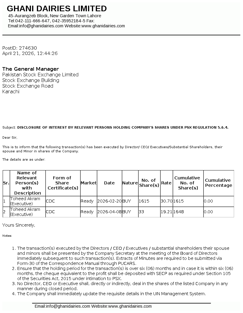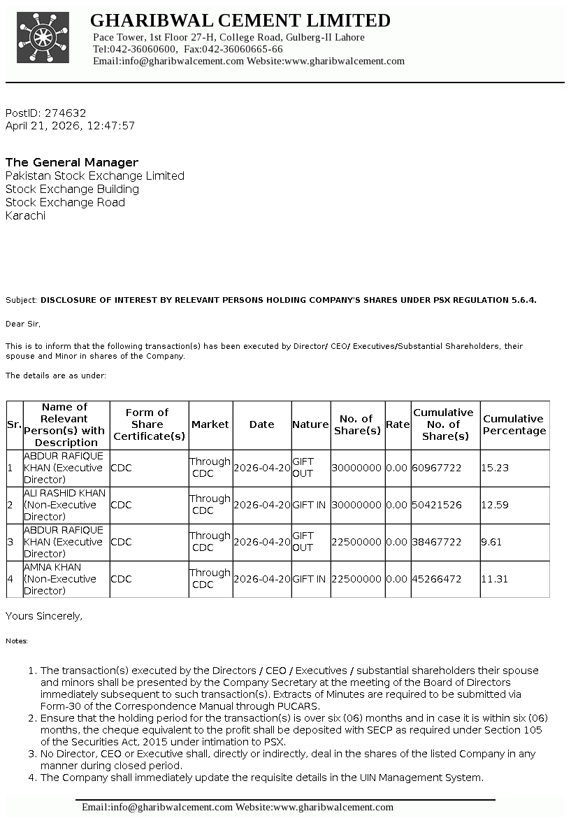 Disclosure of Interest by a Director CEO, or Executive of a listed company and their Spouses and the Substantial Shareholders u/c 5.6.1.(d) of PSX Regulations