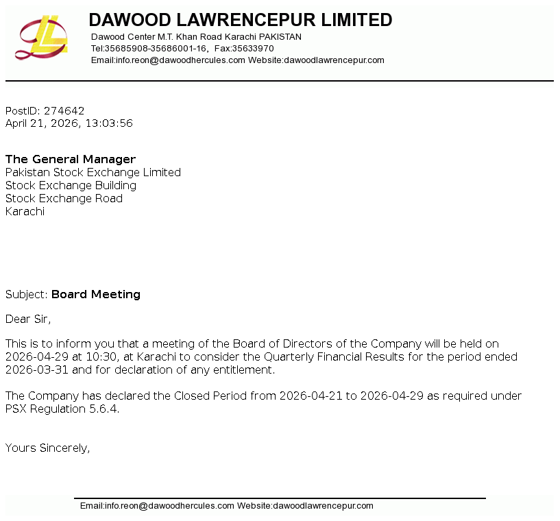 DLL Bonus Meeting Updated Apr 21, 2026, 08:03 AM Dawood Lawrancepur Limited BOARD MEETING Key Information Period Ended Mar 31, 2026Meeting Date Apr 29, 2026Meeting Agenda Quarterly Related Documents Download PDF View Image