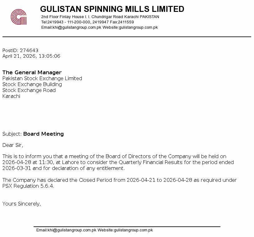 GUSM Bonus Meeting Updated Apr 21, 2026, 08:05 AM Gulistan Spinning Mills Limited Board Meeting Key Information Period Ended Mar 31, 2026Meeting Date Apr 28, 2026Meeting Agenda Quarterly Related Documents Download PDF View Image