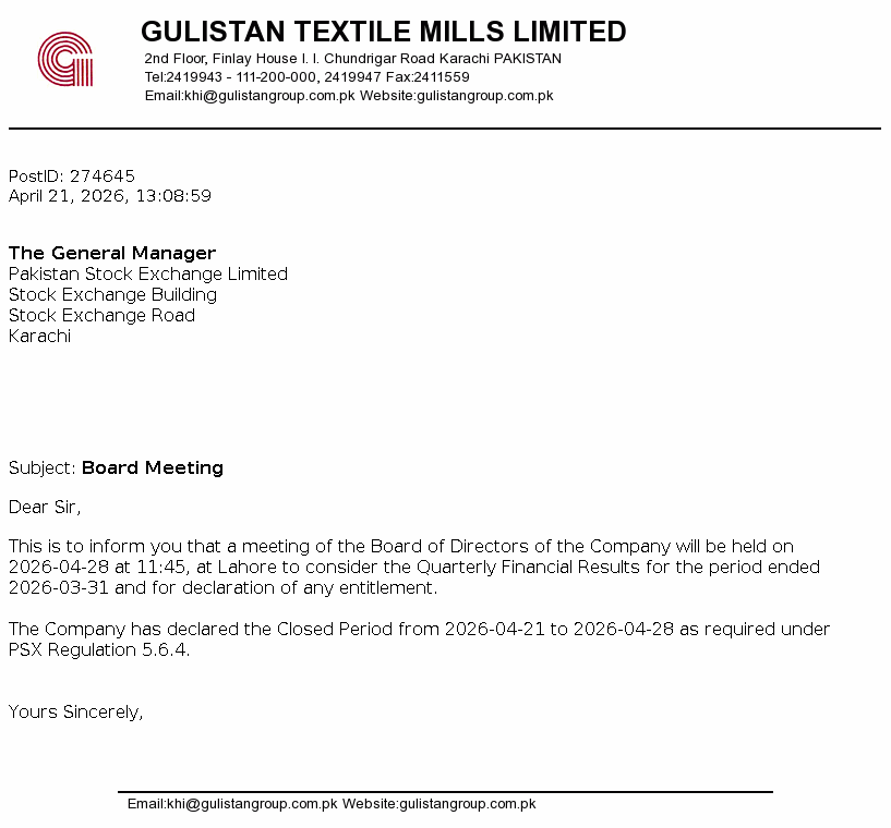 GUTM Bonus Meeting Updated Apr 21, 2026, 08:09 AM Gulistan Textile Mills Limited Board Meeting Key Information Period Ended Mar 31, 2026Meeting Date Apr 28, 2026Meeting Agenda Quarterly Related Documents Download PDF View Image