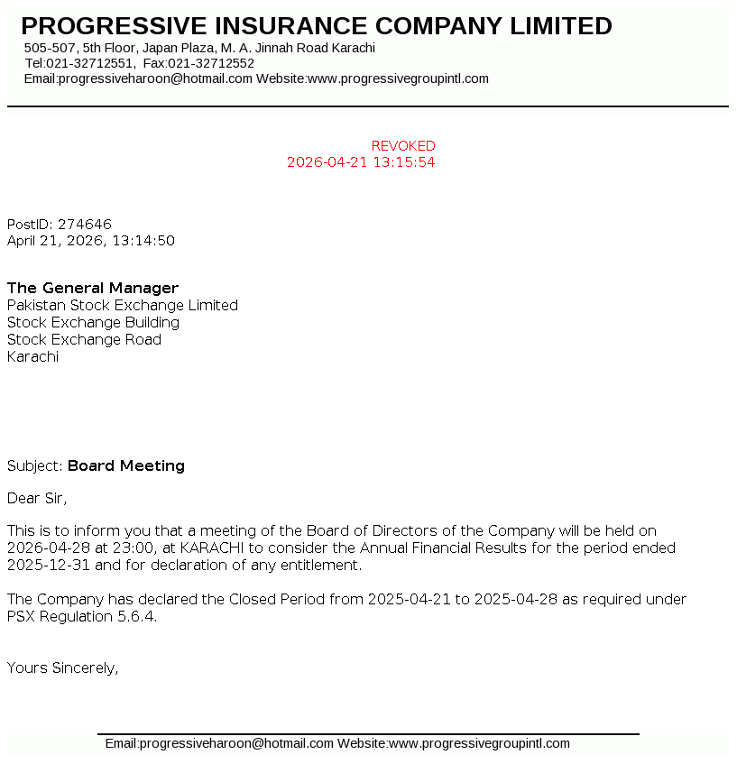 PRIC Bonus Meeting Updated Apr 21, 2026, 08:14 AM Progressive Insurance Board Meeting Key Information Period Ended Dec 31, 2025Meeting Date Apr 28, 2026Meeting Agenda Annual Related Documents Download PDF View Image