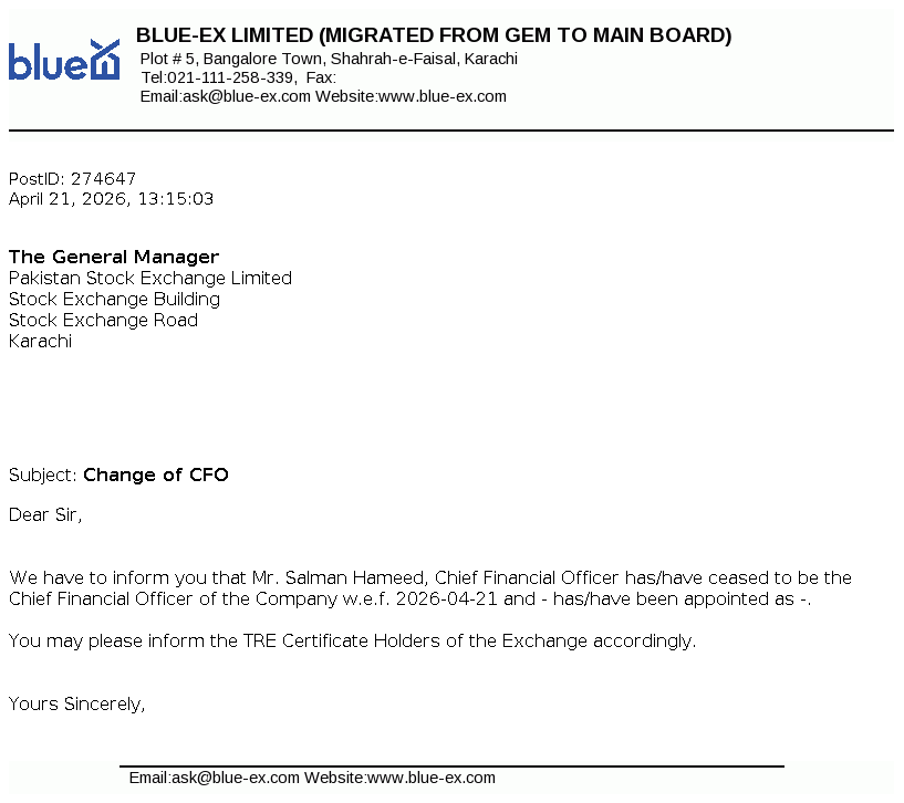 BLUEX Corporate Action Updated Apr 21, 2026, 08:15 AM Blue-Ex Limited Resignation of CFO Related Documents View Image